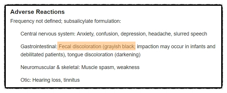 알비스(Albis)에 포함된 비스무트시트르산염칼륨(bismuth)가 흑색변을 일으킬 수 있습니다.