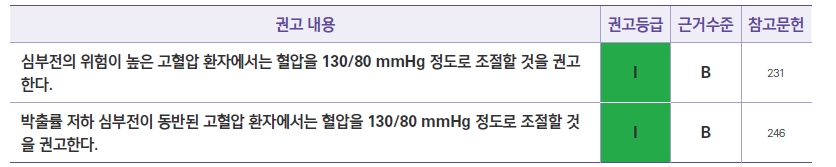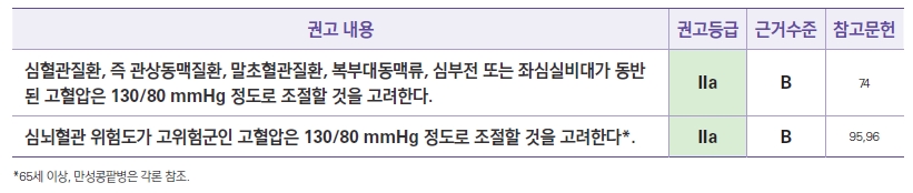 심혈관질환이 동반된 고혈압이나 심뇌혈관 위험도가 고위험군인 혈압은 130/80 mmHg 정도로 조절할 것을 고