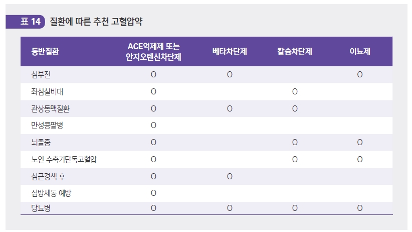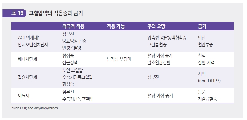 약의 선택은 혈압 수치보다는 환자의 임상적 특성과 동반질환에 따라 결정하는 것이 좋다. 강압 작용에 효과적이며 안전성이 입증되고 부작용도 비교적 경미하여 일차약제로 사용되고 있는 고혈압약은 크게 5가지로 분류한다: 1) ACE억제제 또는 안지오텐신차단제, 2) 베타차단제 (알파-베타차단제 포함), 3) 칼슘차단제, 4)티아지드 (티아자이드)계 또는 티아지드 유사 이뇨제, 5) 기타 약물 (루프 이뇨제, 알도스테론길항제, 알파차단제, 혈관확장제 등). 이들 약은 용량을 조절하면 강압 효과의 강도는 서로 비슷하지만, 개개인의 강압 및 장기적 심혈관 예방 효과와 부작용 발생에 있어서 차이를 나타낼 수 있다. 환자가 다른 질환을 동반하거나 위험 인자가 있을 때는 이를 고려하여 고혈압약을 선택한다<표 14>. 따라서 어떤 약이 다른 약보다 더 우위에 있다고 비교하기 어려우므로 부작용을 고려하여 환자 개인의 특성에 맞도록 고혈압약을 선택하여 우선 투여해야한다<표 15>.