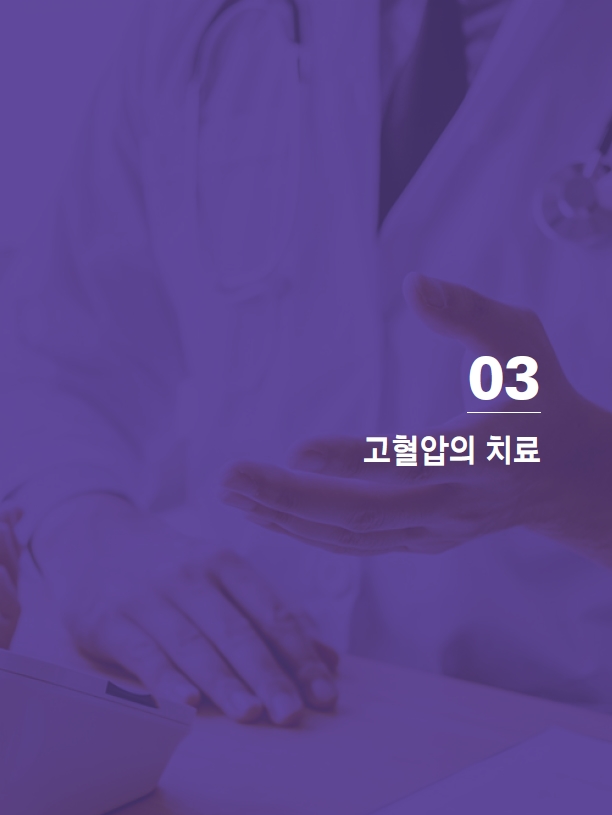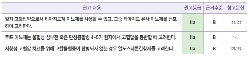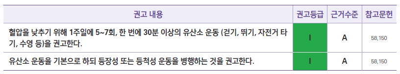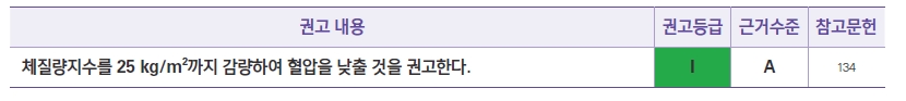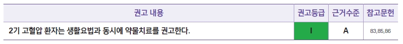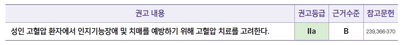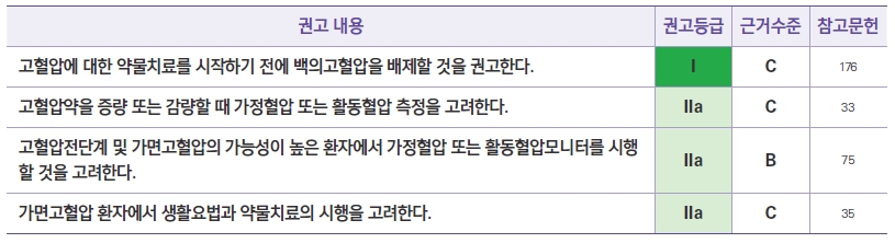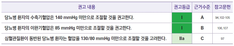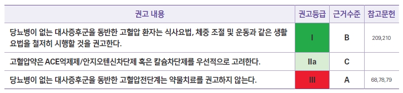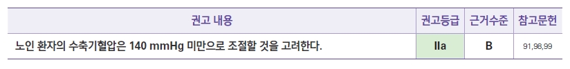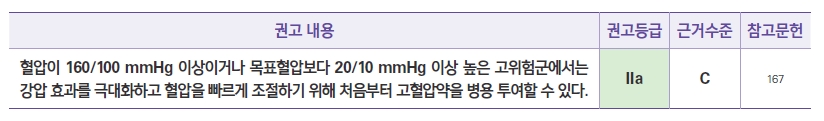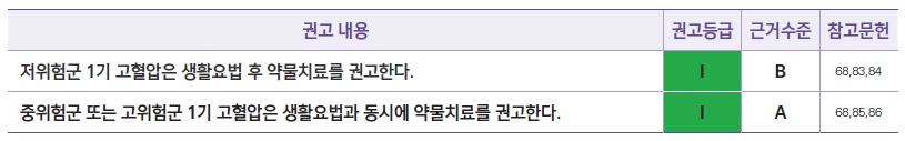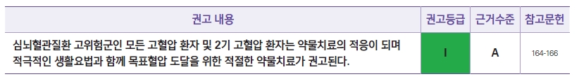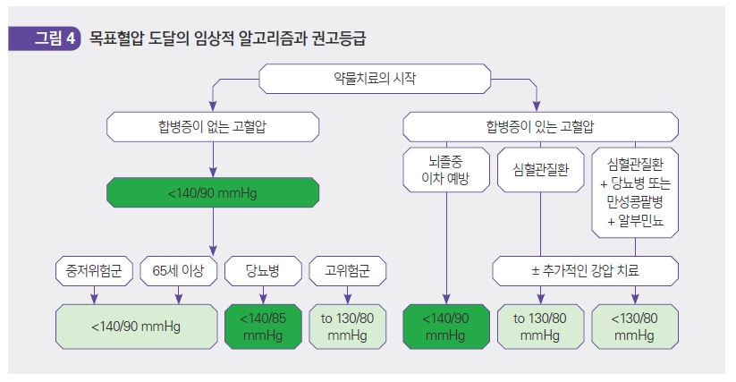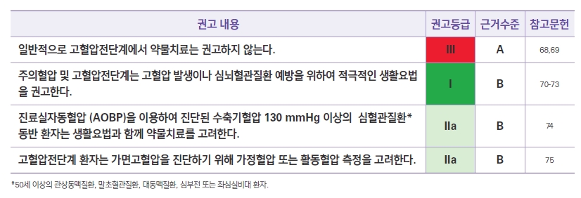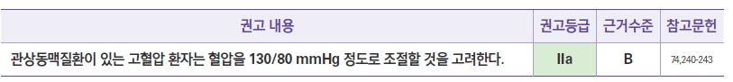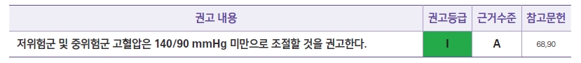 려한다. 반면, 심뇌혈관 위험도가 중위험군 또는 저위험군인 혈압은 기존처럼 140/90 mmHg 미만으로 조절할 것을 권고한다.