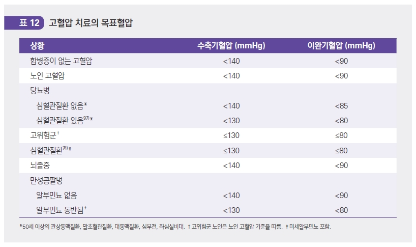 <표 12>에서 보는 바와 같이 특별한 경우가 아니면, 일반적으로 목표혈압은 수축기혈압 140 mmHg 미만, 이완