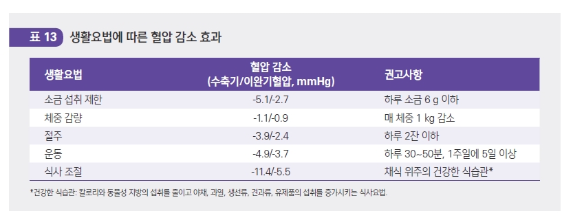 건강한 식사습관, 운동, 금연, 절주 등과 같은 비약물치료 또는 생활요법은 혈압을 떨어뜨리는 효과가 뚜렷하기 때문에 모든 고혈압 환자에게 중요할 뿐 아니라, 주의혈압 및 고혈압전단계 혈압인 사람에게도 고혈압의 예방을 위하여 적극적으로 권장한다<표 13>. 좋은 생활습관은 고혈압약 한 개 정도의 혈압 강하 효과가 있다. 또 약물치료를 시행하고 있는 고혈압 환자도 생활요법을 병행함으로써 복용 약의 용량 및 개수를 줄이고 약의 효과를 최대화하며 부작용을 줄일 수 있다. 또한 생활습관을 개선하면 혈압을 낮추는 효과 이외에도 다른 심혈관 위험을 동시에 감소시키는 효과도 얻을 수 있다. 그러나 생활요법은 지속적으로 유지하기가 매우 어렵고, 효과 면에서 최대한 노력하더라도 2기 이상의 고혈압에서는 목표혈압까지 혈압을 낮추기는 어렵다. 따라서 고혈압 환자에게 지속적으로 생활요법을 유지할 수 있도록 동기를 부여하면서 동시에 생활요법의 한계점을 충분히 이해하도록 교육해야 한다. 또한, 한 가지 방법보다는 여러 가지 방법을 병행하여 생활습관을 개선하면 효과가 더크게 나타나므로 심뇌혈관질환을 최소화하려는 목표를 달성하기 위해서는 동시에 시행하도록 권고한다.
