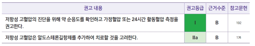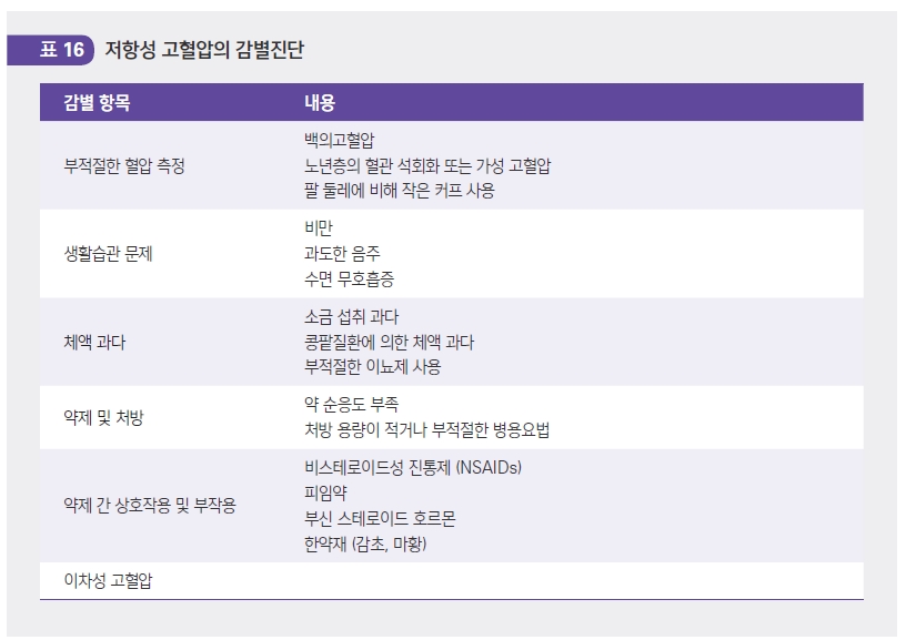 일반적으로 이뇨제를 포함하여 작용기전이 다른 고혈압약을 3가지 이상 병용 투여하고 각각의 약의 용량을 최적 용량으로 투여하여도 혈압이 140/90 mmHg 미만으로 조절되지 않는 경우를 ‘저항성 고혈압’이라 한다. 국내 자료는 없으나 외국에서는 치료 중인 환자의 저항성 고혈압 유병률은 5~30%로 보고되었는데, 가성 저항성 고혈압을 감안하면 실제로는 10% 미만일 것으로 추측한다58). 저항성 고혈압 환자에서 심뇌혈관질환과 콩팥질환 합병증의 발생 위험이 더 높다. 저항성 고혈압의 발생 원인은 다양하지만<표 16>, 고혈압약 복용을 지시대로 따르지 않는 환자의 순응도 부족이 가장 흔한 원인이다. 그리고 감기약, 비스테로이드 소염진통제, 부신피질 스테로이드, 피임약, 과도한 소금 섭취, 과음 등이 원인이 될 수 있다. 고혈압약에 이뇨제가 포함되지 않았을 때는 용적 과부하로 저항성 고혈압이 될 수 있다. 또한 이차성 고혈압이 원인일 수도 있다. 저항성 고혈압의 진단 시 먼저 약 순응도를 확인하고, 가정혈압이나 활동혈압을 측정하여 백의고혈압을 배제한 후 저항성 고혈압에 대한 원인을 규명하여야 한다. 3가지 서로 다른 기전의 약을 충분한 용량으로 사용 하였음에도 불구하고 혈압이 조절되지 않으면 이뇨제 용량을 증량 또는 교체하거나, 콩팥기능이 떨어져 있으면 티아지드계 이뇨제 대신 루프 이뇨제를 사용한다. 혈압을 조절하기 위해서 spironolactone, amiloride 또는 doxazosin을 추가로 처방할 수 있다. ACE억제제 또는 안지오텐신차단제를 복용 중인 환자에게 spironolactone 또는 amiloride를 처방한 경우 1~2주 이내에 혈청 칼륨 수치를 확인하여야 한다.