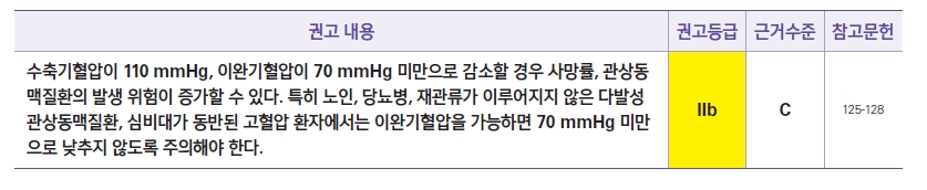 관상동맥질환을 동반한 고혈압 환자의 수축기혈압을 130 mmHg 미만으로 감소시킨 연구에서 심뇌혈관질환 예방에 대한 효과는 일관성이 부족하다. 그러나 메타분석과 SPRINT 연구를 고려하여 수축기혈압을 가급적 130 mmHg에 가깝게 적극적으로 조절하는 것을 고려한다.