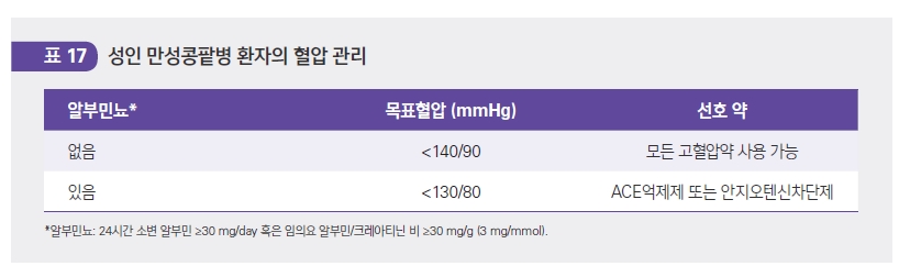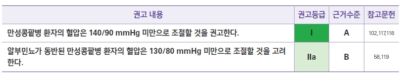 우리나라 및 외국의 여러 진료지침과는 달리 미국 진료지침에서는 만성콩팥병의 목표혈압을 130/80 mmHg 미만으로 권고하였으나298) 대상 환자의 특성과 혈압 측정 방법에 차이가 있어 논란이 있다. 따라서 알부민뇨가 없는 만성콩팥병 환자는 수축기혈압 140 mmHg 미만, 이완기혈압 90 mmHg 미만으로 조절하도록 권고한다. 다만 알부민뇨를 동반한 만성콩팥병 환자의 목표혈압은 수축기혈압 130 mmHg 미만이 바람직하다. 이러한 혈압 조절의 목표는 당뇨병 동반 여부와 무관하다.