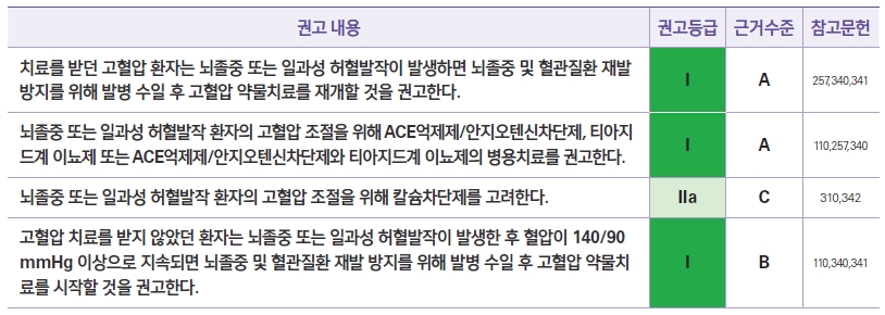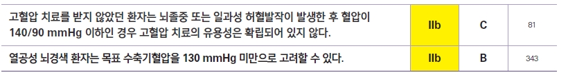 고혈압이 뇌졸중 발생에 가장 중요한 위험인자이며 혈압 치료 결과에 따라 뇌졸중 재발 및 심뇌혈관질환 사건을 감소시키지만, 수축기혈압을 130 mmHg 미만으로 조절한 임상연구의 결과는 뚜렷한 이득이 없었다. 특히 뇌경색 환자에서 수축기혈압을 140 mmHg 미만으로 조절하여도 더 나은 결과를 보여주지 못한 연구 결과도 있다. 이상의 연구 결과를 고려하여 뇌졸중 환자의 수축기혈압 조절 목표를 140 mmHg 미만으로 권고한다<그림 4>.