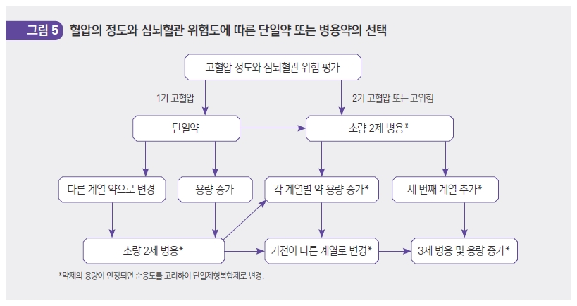 고혈압 환자의 2/3 이상에서는 1가지 종류의 고혈압약으로 조절되지 않으며 기전이 서로 다른 2가지 이상의 고혈압약이 필요하다. 특히 혈압 치료가 장기화될수록, 임상적 위험도가 높거나 목표혈압이 낮은 환자일수록 이러한 경향이 뚜렷하다. 처음 사용한 일차약제에 효과가 없을 때는 다른 약으로 교체하고, 약간의 효과는 있으나 목표혈압에 도달하지 못하면 용량을 증량하거나 다른 기전의 약을 추가한다. 그러나 용량을 증량하기보다는 서로 작용이 다른 약을 소량씩 추가하면 강압 효과와 순응도를 동시에 높이면서 부작용은 감소시킬 수 있는 장점이 있다<그림5>186). 또한 고위험 고혈압에서는 혈압을 목표혈압 이하로 빨리 감소시킬수록 예후를 개선할 수 있다. 따라서 2기 고혈압 이상이거나 고위험 고혈압에서는 처음부터 병용요법의 사용을 권고한다. 그리고 이러한 경우에는 약 순응도를 개선시킨다는 측면에서 초치료로 단일제형복합제를 고려해 볼 수 있다. 그러나 단일제형복합제는 약물의 부작용이 발생했을 때 약물 용량을 자유롭게 조절하지 못한다는 단점이 있고, 기존의 병용요법과 직접 비교한 연구가 없기 때문에 단일제형복합제의 선택 여부는 환자의 순응도, 부작용 발생 가능성, 목표혈압을 고려하여 결정해도 무방하다.
