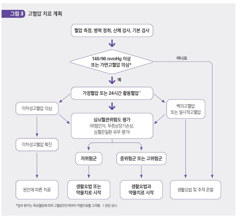 처음 혈압이 높게 측정되면 치료를 시작하기 전에 가급적 진료실 이외 혈압 (가정혈압 또는 24시간 활동혈압)을 측정하여 고혈압 유무를 정확히 진단하여야 한다. 진료실 밖에서 측정된 혈압은 고혈압을 정확히 진단하는데 도움이 될 뿐만 아니라, 고혈압 치료의 적정성 평가에 도움이 되며 치료에 대한 환자의 순응도를 높인다. 고혈압으로 진단되면 심뇌혈관질환의 위험인자, 동반질환, 고혈압 합병증 유무 등을 조사해야 한다<그림 3>. 진료실 혈압만 높은 백의고혈압 환자도 향후 심뇌혈관질환의 발생 위험이 증가할 수 있기 때문에 3~6개월 간격으로 주기적인 검진을 받아야 한다. 약물치료의 시작 시기는 혈압의 수치뿐만 아니라 심뇌혈관질환의 위험 인자 및 목표장기의 손상 유무를 고려하여 결정하여야 한다. 약물치료는 위험인자 또는 동반질환 유무에 상관 없이 혈압이 140/90 mmHg 이상인 환자에게 시행할 수 있다. 고혈압 약물치료는 비약물치료 (생활요법)와 동시에 시행하여야 한다. 고혈압 환자의 삶의 질은 고혈압으로 인한 신체적, 정신적 문제, 약의 영향 및 부작용, 환자-의사 관계 등에 의해 영향을 받는다. 충분한 의사소통 및 정보 제공과 함께 약의 개수와 복용 횟수를 줄임으로써 환자의 순응도를 높이고 혈압 조절률을 향상시켜 지속적인 치료가 될 수 있도록 해야 한다.