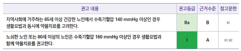 고령의 환자에서도 고혈압의 약물치료 효과는 뚜렷하다. 80세 이상, 노쇠한 노인 환자를 포함한 모든 노인 환자는 수축기혈압이 160 mmHg가 넘으면 약물치료를 시행하고, 140~159 mmHg인 경우에도 약물치료에 잘 적응할 것으로 기대되는 건강한 노인은 약물치료를 고려할 수 있다.