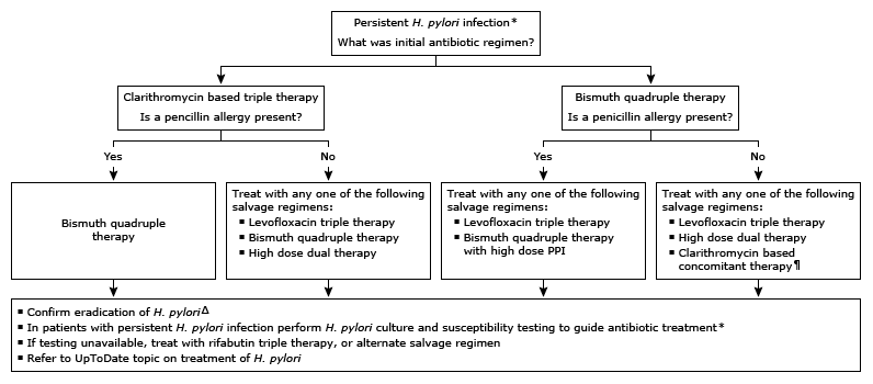 Δ Eradication of H. pylori infection can be confirmed with a urea breath test, stool antigen testing, or upper endoscopy-based testing. The choice of test depends on the need for an upper endoscopy (eg, follow-up of bleeding peptic ulcer) and local availability. H. pyloriserology should not be used to confirm eradication of H. pylori. Refer to UpToDate topic on diagnostic tests for H. pylori.
