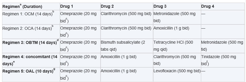 cMany authorities and some guidelines recommend doubling this dose of omeprazole, as trials show resultant increased efficacy with some antibiotic combinations. Omeprazole may be replaced with any proton pump inhibitor at an equivalent dosage. Because extensive metabolizers of PPIs are prevalent among Caucasian populations, many authorities recommend esomeprazole (40 mg bid) or rabeprazole (20 mg bid), particularly for regimens 4 and 5.