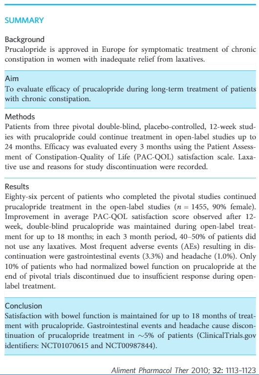 유럽과 캐나다에서 가능하지만 미국에서는 볼 수없는 이 5HT4 prokinetic agent는 1 일 1 회 1 ~ 4mg의 복용량으로 4-12 주간의 임상 시험에서 위약보다 우월하였고 65 세 이상의 환자에서 안전하고 내약성이 좋았습니다. 3 건의 임상 시험의 환자들을 open-label studies로 24 개월까지 추적 관찰했습니다. 12 주 임상 시험 끝에서 볼 수 있는 삶의 질 점수 향상은 최대 18 개월 동안 유지되었습니다.
