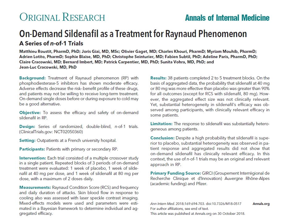 Raynaud phenomenon (RP)을 가진 많은 환자들이 attacks(발작, event)에 대한 trigger(유발 인자)를 인지하기 때문에, 매일 치료를 피하고자 하는 환자에게는 혈관 확장제의 on-demand doses가 바람직한 접근법일 수 있습니다. RP 환자 38 명에서 n-of-1 trials을 사용한 연구는 추위에 노출되기 전이나 노출되는 동안 on-demand sildenafil 사용에 대한 임상적으로 관련된 효과를 입증하지 못했습니다. 이 분석에서 sildenafil이 위약보다 우월한 높은 가능성을 보였을지라도, 환자 반응 간에는 상당한 이질성이 있었으며 몇 가지 경우에만 attack 빈도와 기간에 임상적으로 관련된 이득이 있었습니다.
