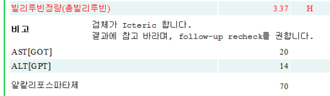 Twin 형제도 같은 Gilbert syndrome이 있다고 하며, 시행한 혈액검사에서 다른 혈액검사 수치는 정상이지만 총빌리루빈만 상승하였습니다.