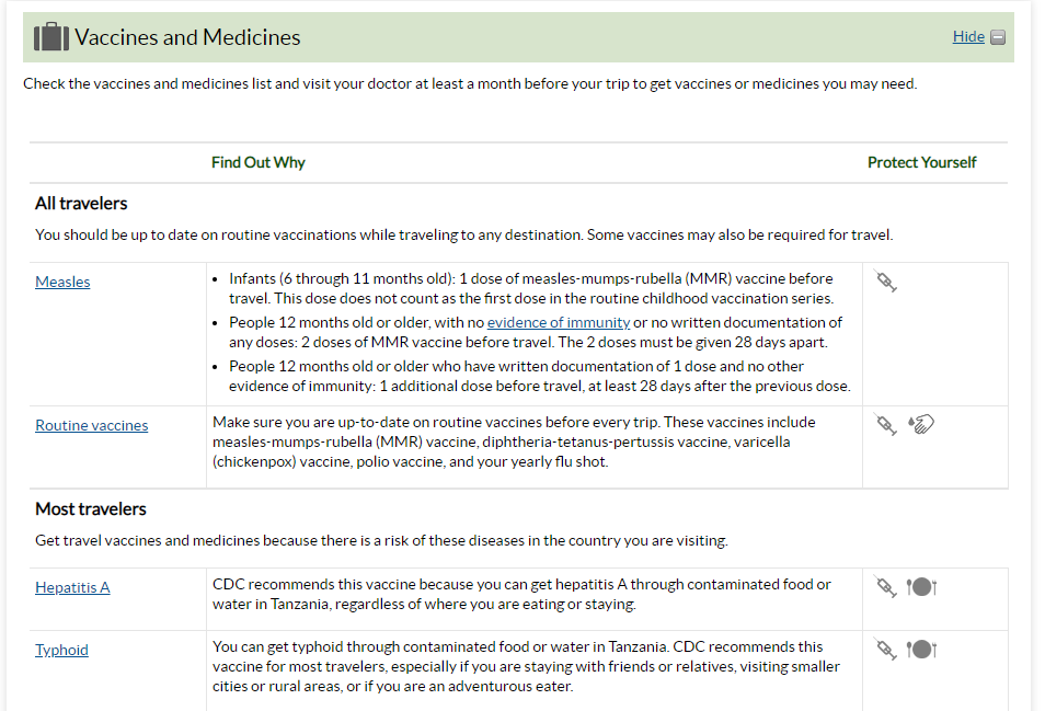 홍역을 포함한 routine vaccines(MMR, DTP, chicken pox, polio, flu)은 모든 여행자들에게 필요하므로 놓친 것 있으면 예방 조치를 취해야 하며, A형 간염과 장티프스도 예방접종을 권고하고 있습니다.