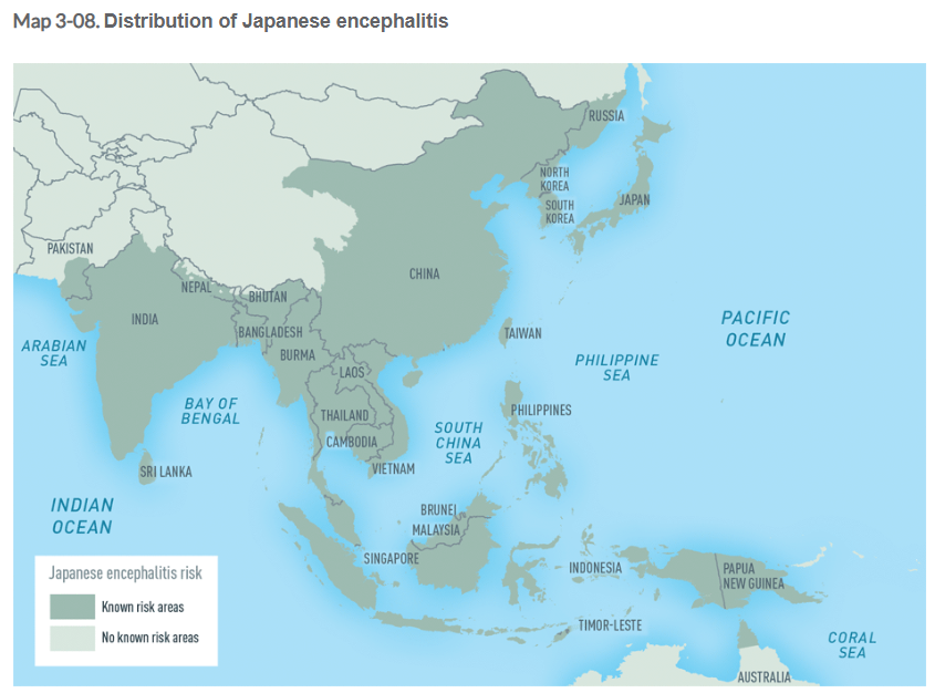 Japanese encephalitis (JE) is an arboviral encephalitis endemic throughout most of Asia and parts of the western Pacific. The highest risk of JE exposure occurs in rural agricultural areas, often associated with rice production and flooding irrigation.