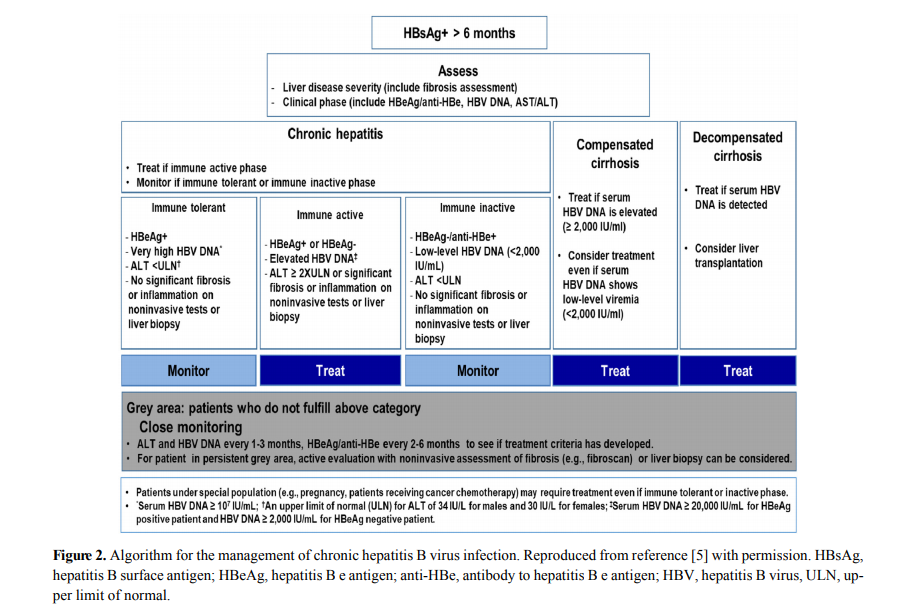 항바이러스 치료 시작을 결정하는 데에는 크게 1) 간 질환의 진행 정도, 2) HBV의 증식 정도, 3) 간손상의 동반 여부와 같은 요소들을 고려한다(Fig. 2).