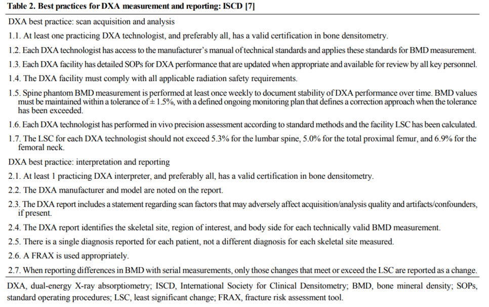 DXA로 골밀도를 측정하는 경우 기계의 정밀 오차를 확인 해야 하며 검사자는 검사 술기를 습득하고 100명의 환자를 대상으로 훈련 과정을 거친 뒤 정밀도를 검사한다. ISCD에 서는 무작위로 환자를 선발하여 15명을 3번 측정하거나 30명을 2번 측정하여 정밀도를 검사하도록 하고 있으며, 재측정 시 환자는 반드시 검사대에서 내려왔다가 다시 올라가게 하여 자세를 재조정하도록 한다. 보정(calibration)을 위해서 척추 팬텀을 사용하며, 팬텀은 칼슘 하이드록시아파타이트 (calcium hydroxyapatite) 재질로 인체와 유사한 3가지 조건(저 밀도-정상-고밀도)으로 된 척추의 모양으로 만들어져 있다. ISCD에서는 보정을 위하여 최소 1주에 1회 팬텀 스캔을 권고하고 있다. 또한 DXA 하드웨어가 변경된 경우 또는 동일한 기술을 갖춘 시스템이 교체된 경우 교차 보정(cross calibration)을 수행하여 시스템과의 정량적 비교를 허용할 것을 권장하고 있다. 교차 보정은 교체 전과 후 팬텀을 이용하여 10회씩 측정한 후 평균 골밀도의 차이가 1% 이상인 경우 제조업체에 수정을 요구하도록 한다. 그 외에도 실제 DXA를 측정하고 결과를 해석, 보고할 때에는 여러 가지 주의해야 할 점이 있으며, ISCD에서는 각각의 단계에서 주의해야 할 점을 표로 정리하여 체크하도록 권고하고 있다(Table 2) [7].