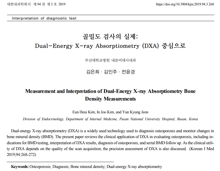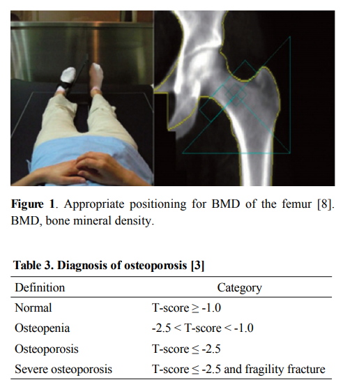 골다공증은 골량의 감소와 미세구조의 이상을 특징으로 하는 전신적인 골격계 질환으로서 결과적으로 ‘뼈가 약해져 서 부러지기 쉬운 상태가 되는 질환’으로 정의하고 있다. 세계보건기구(World Health Organization, WHO)에서는 ‘골다공증’이라는 용어를, 폐경 후 여성과 50세 이상의 남성을 대상으로 한정하여 골밀도 검사상 T-점수가 -2.5 이하인 경우로 정의하고 있으며, 50세 이하의 남성과 폐경 전 여성에서 는 Z-점수 -2.0을 기준으로 ‘연령 기대치 이하 또는 연령 기대치 이내’로 진단하고 있다. 현재 골밀도를 측정하는 방법은 초음파 검사(quantitative ultrasonography, QUS), 정량적 전산화 단층 골밀도 검사(quantitative computed tomography, QCT), 말단골 골밀도 검사(peripheral quantitative computed tomography, pQCT) 등이 다양하게 이용되고 있다. 그러나 QUS의 경우 골다공증 골절의 발생 예측에는 사용할 수 있지만 정밀도가 낮아서 약물 치료에 대한 반응을 판단하기 어렵고, 중심골 QCT의 경우 민감도가 높아 t값으로 진단하면 과잉 진단을 할 수 있어 기준을 mg/cm3 로 진단해야 하며, 현재 척추 골밀도에 대한 값만 우리나라 보험에서 인정된다. 따라서 본 논문에서는 이중에너지 엑스선 흡수계측법(dual energy X-ray absorptiometry, DXA)을 이용한 골밀도 검사에 한정하여 골밀도 검사의 실제에 대하여 알아보고자 한다.