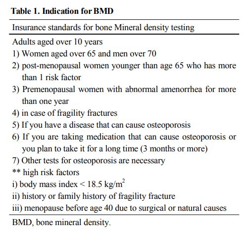 세계임상골밀도측정학회(International Society for Clinical Densitometry, ISCD)에서는 65세 이상의 여성과 70세 이상의 남성에서 골밀도 검사를 권고하고 있으며, 65세 미만의 여성과 70세 미만의 남성이더라도 저체중, 이전의 골절력, 골다공증을 유발할 수 있는 질환이 있거나 약물을 복용 중인 경우, 골감소를 유발할 수 있는 질환이나 상태에 있는 경우, 골다공증 치료를 시작하거나 치료 효과를 판정하기 위한 경우 골밀도 측정을 권고하고 있다. 최근 개정된 국내 보험(고시 제 2019-28호)에서도 만 18세 이상 성인을 대상으로 1) 65세 이상 여성과 70세 이상 남성, 2) 고위험요소가 1개 이상 있는 65세 미만의 폐경 후 여성(고위험요소는 체질량지수 < 18.5 kg/m2 인 경우, 비외성성 골절의 과거력이 있거나 가족력이 있는 경우, 외과적 수술로 인한 폐경 또는 40세 이전의 자연 폐경인 경우), 3) 비정상적으로 1년 이상 무월경을 보이는 폐경 전 여성, 4) 비외상성(fragility) 골절인 경우, 5) 골다공증을 유발 할 수 있는 질환이 있는 경우, 6) 골다공증을 유발할 수 있는 약물을 복용 중이거나 장기간(3개월 이상) 투여 계획이 있는 경우, 7) 기타 골다공증 검사가 반드시 필요한 경우 골밀도 검사를 인정하고 있다(Table 1). 이번 개정에서 여섯 번째 항목인 골다공증을 유발할 수 있는 약물 복용에 ‘장기간(3개월 이상) 투여 계획이 있는 경우’가 추가되었다.