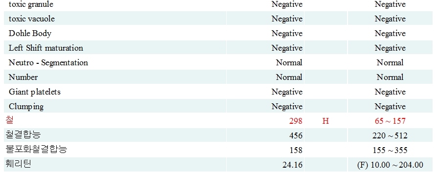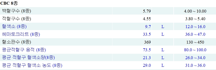 혈액검사에서 빈혈 진단 받고 철분제를 몇 일 복용하고 내원하였습니다.