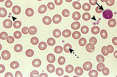 High-power view of a normal peripheral blood smear. Several platelets (arrowheads) and a normal lymphocyte (arrow) can also be seen. The red cells are of relatively uniform size and shape. The diameter of the normal red cell should approximate that of the nucleus of the small lymphocyte; central pallor (dashed arrow) should equal one-third of its diameter.