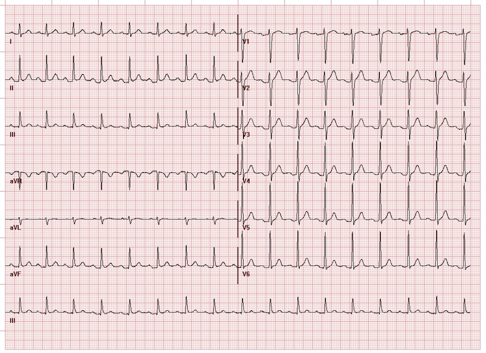 2. Atrial tachycardia인가? 이전 baseline 심전도와 비교하면 lead I, II P파 모양이 바뀌었는지 확인하면 도움이 될 것 같은데 없다. 한편으로 Lead I, II가 P파가 upright라고 무조건 sinus tachycardia인 것은 아니고 SA node와 가까운 곳, superior crista terminalis 근처의 AT에서는 leads I, II 모두 P파가 upright이다. AT일까?