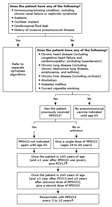 Δ The ACIP recommends a dose of PPSV23 at or after 65 years of age but does not recommend additional doses of PPSV23 every 5 to 10 years thereafter; in contrast, UpToDate recommends such revaccination.