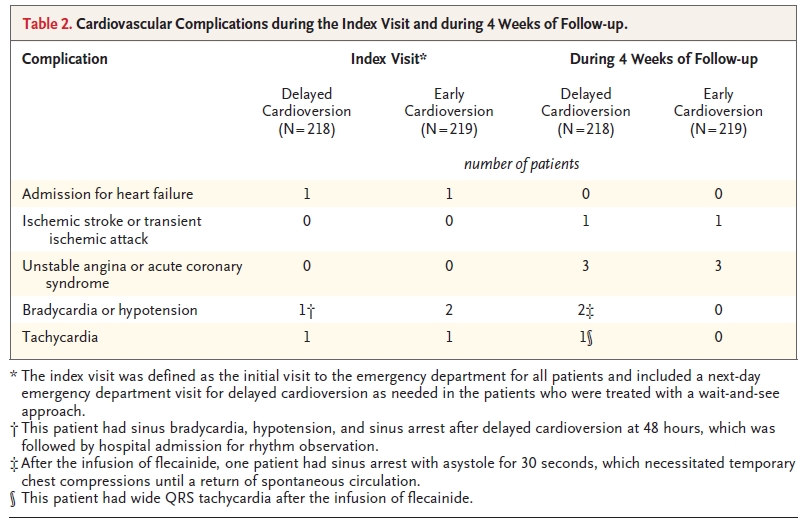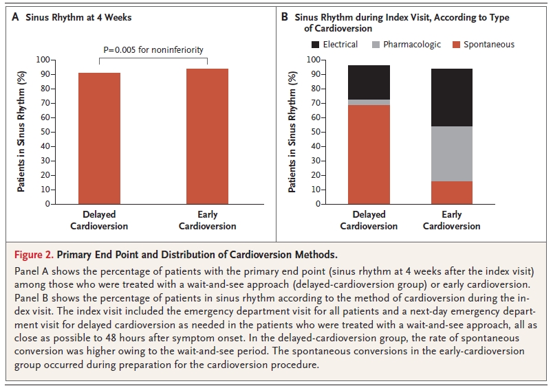 Since many patients with either a first or a recurrent episode of atrial fibrillation (AF) spontaneously revert to sinus rhythm, the optimal timing of cardioversion is not known. This issue was evaluated in the RACE 7 ACWAS randomized trial in symptomatic patients with hemodynamically stable, recent onset (<36 hours) AF presenting to an emergency department. Immediate cardioversion was compared with a wait-and-see approach in which patients were treated with rate-control medication initially and subsequent cardioversion if AF did not resolve within 48 hours. Nearly 70 percent of patients in the delayed cardioversion group spontaneously converted to normal sinus rhythm prior to the initiation of cardioversion. There was no significant difference between the two groups in the rate of sinus rhythm detected at four-week follow-up. Depending on specific patient circumstances, we believe either an early or a delayed approach is reasonable.