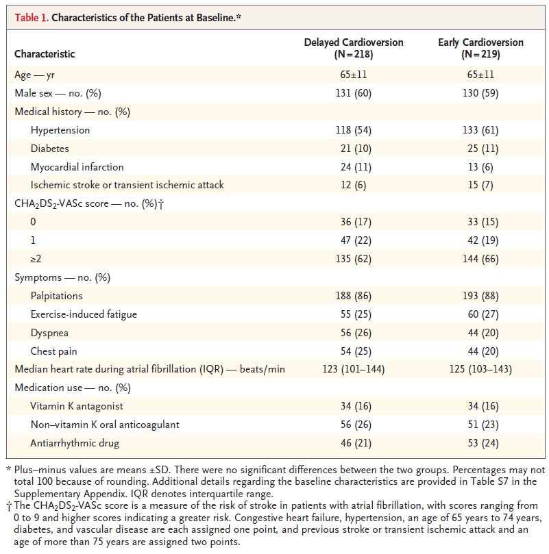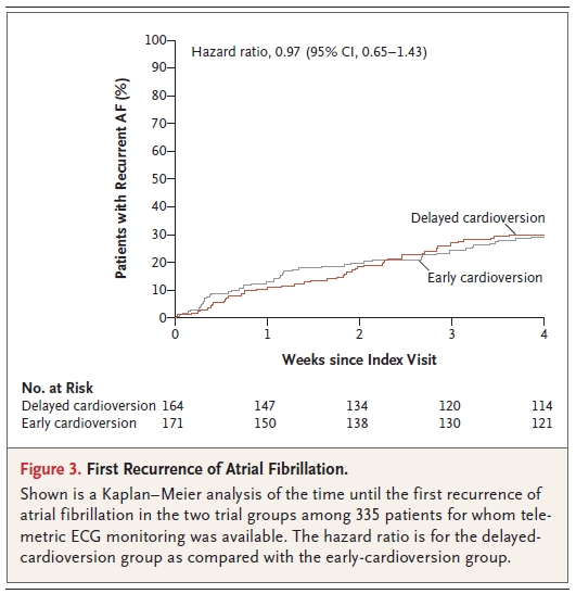 많은 심방 세동 (AF)의 첫 번째 또는 재발 episode는 자연적으로 sinus rhythm으로 되돌아 가기 때문에, cardioversion의 최적 시기는 알려져 있지 않습니다. 이 문제는 응급실로 내원한 혈역학적으로 안정적이고 최근에 발병한 (<36 시간) AF이 있는 증상이 있는 환자를 대상으로 RACE 7 ACWAS 무작위 시험에서 평가되었습니다. 즉각적인 cardioversion은 초기에는 rate control 약물로 치료하고 48 시간 이내에 심방 세동이 해결되지 않으면 이어서 cardioversion으로 치료하는 wait-and-see approach와 비교되었습니다. Delayed cardioversion 그룹의 환자 중 거의 70 %가 cardioversion 시작 이전에 자연적으로 normal sinus rhythm으로 전환되었습니다. 4 주간의 추적 조사에서 확인된 sinus rhythm의 비율은 두 그룹 사이에는 유의한 차이가 없었습니다. 특정 환자 상황에 따라, 우리는 early approach 또는 delayed approach가 합리적이라고 생각합니다.