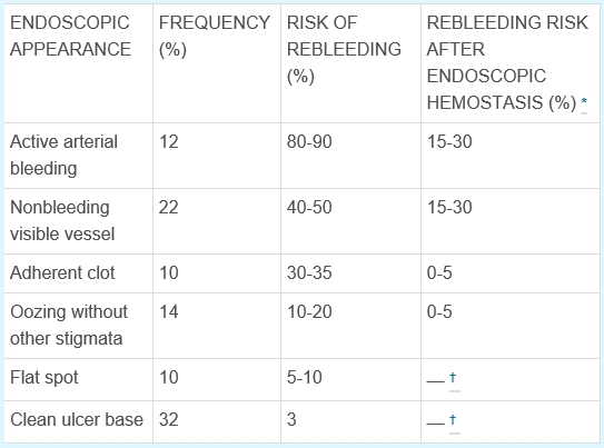 * Reduction in bleeding risk is with the administration of a proton pump inhibitor, after successful endoscopic hemostasis.