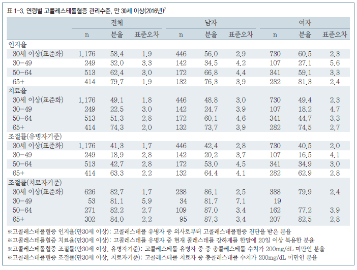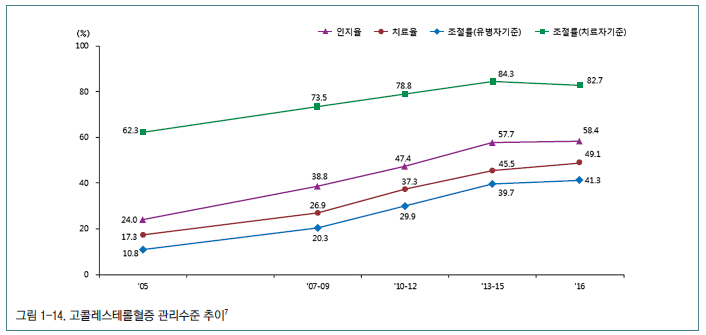 다행히 고콜레스테롤혈증의 인지율, 치료율, 조절률 등의 관리지표는 개선되고 있었다. 고콜레스테롤혈증 인지율(유병자 중 의사로부터 진단받은 비율)은 2005년 24%에서 2016년 58%로 향상되었으며, 같은 기간 치료율(유병자 중 콜레스테롤강하제 복용한 비율)은 17%에서 49%로, 유병자 조절률(유병자 중 총콜레스테롤 200 mg/dL 미만인 비율)은 11%에서 41%로, 치료자 조절률(치료자 중 총콜레스테롤 200 mg/dL 미만인 비율)은 62%에서 83%로 각각 향상되었다(그림 1-14). 이러한 관리지표는 전반적으로 남녀 모두에서 향상되고 있으나, 50세 미만의 인지율 및 치료율은 최근까지도 20–30% 정도의 낮은 비율을 보였다(표 1-3).
