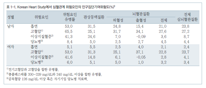 국내 코호트 연구에서 주요 심혈관계 위험요인이 질병발생에 얼마나 기여하는가를 나타내는 인구집단 기여 위험도(population attributable risk)를 분석한 결과 한국인의 심뇌혈관계질환에 가장 많은 영향을 미치는 위험요인은 남자의 경우 고혈압, 흡연, 이상지질혈증, 당뇨병 순으로 확인되었고 네 가지 위험요인을 모두 합하면 기여 위험도가 64%에 달하였다. 여자의 경우 심뇌혈관계질환에 가장 많은 영향을 미치는 위험요인은 고혈압, 이상지질혈증, 당뇨병, 흡연 순이었다(표 1-1). 이 연구에서 관찰된 위험요인과 심뇌혈관질환 발생의 위험도의 연관성을 살펴본 비교위험도(relative risk)를 보면, 흡연과 이상지질혈증의 위험요인은 뇌혈관질환보다 관상동맥질환과의 연관성이 더 높았고, 고혈압은 관상동맥질환보다는 뇌혈관질환과의 연관성이 더 높았다(표 1-2).