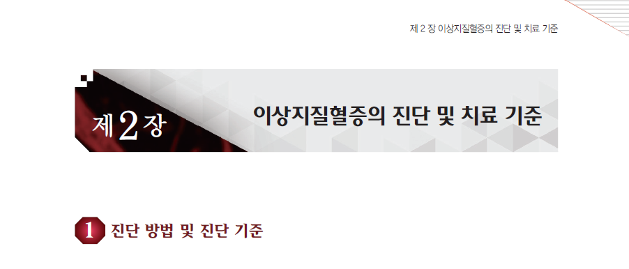 이상지질혈증 진단 기준 설정 시 근거자료로 이상지질혈증과 심혈관질환 위험도에 관한 역학연구 자료와 환자가 속한 인구집단의 지질농도 분포상에서 특정한 백분위수(percentile) 자료 등을 사용할 수 있다. 또한 이상지질혈증 치료지침에서도 이상지질혈증 농도 값 특히 LDL 콜레스테롤 농도 값을 치료방침 판단 기준에 사용하고 있어 이에 대한 고려가 필요하다. 위와 같은 사항을 고려하고, 국민건강영양조사의 결과에서 나타난 지질 농도의 분포를 감안하여 표 2-1과 같이 이상지질혈증 진단 기준을 설정하였다.
