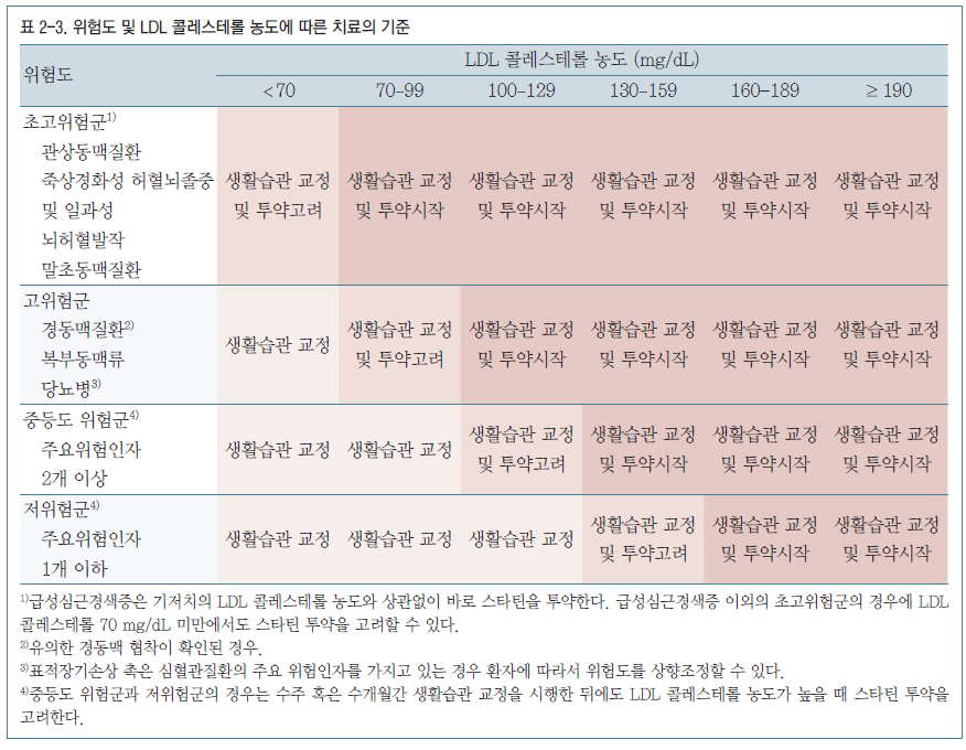 새로운 국내 치료지침에서는 기존에 국내의 치료지침에서 제시했던 대로 심혈관계 위험요인들의 유무를 판단하여 위험 수준에 따라 목표 LDL 콜레스테롤 농도를 차등 설정하는 틀을 유지하되, 구체적인 위험요인들이나 치료 기준에 관해서는 국내 및 국외의 연구 결과와 2013년 ACC/AHA, 2016년 European Society of Cardiology (ESC)/European Atherosclerosis Society (EAS) 및 각국의 치료지침을 참고하여 수정 및 보완하는 것으로 정하였다(표 2-3, 2-4).