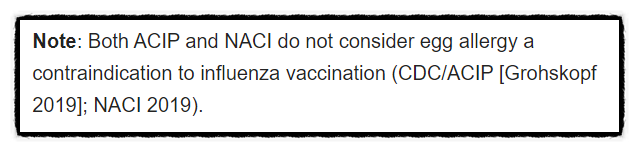 The intranasal live attenuated influenza vaccine(LAIV) and the majority of the intramuscular inactivated influenza vaccines are derived from culture fluid from chicken embryos. As a result, there is a small amount of egg protein in these vaccines. A history of severe allergic reaction to egg protein is considered by the US Food and Drug Administration (FDA) to be a contraindication to LAIV but not to the inactivated vaccines. However, since published data suggest that LAIV is safe in those with egg allergy (including anaphylaxis), patients with egg allergy may receive an influenza vaccine manufactured using eggs, including LAIV, if appropriate precautions are taken. Specific recommendations and the data supporting them are provided separately, UpToDate 2019.10.25
