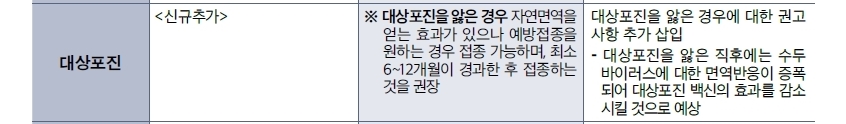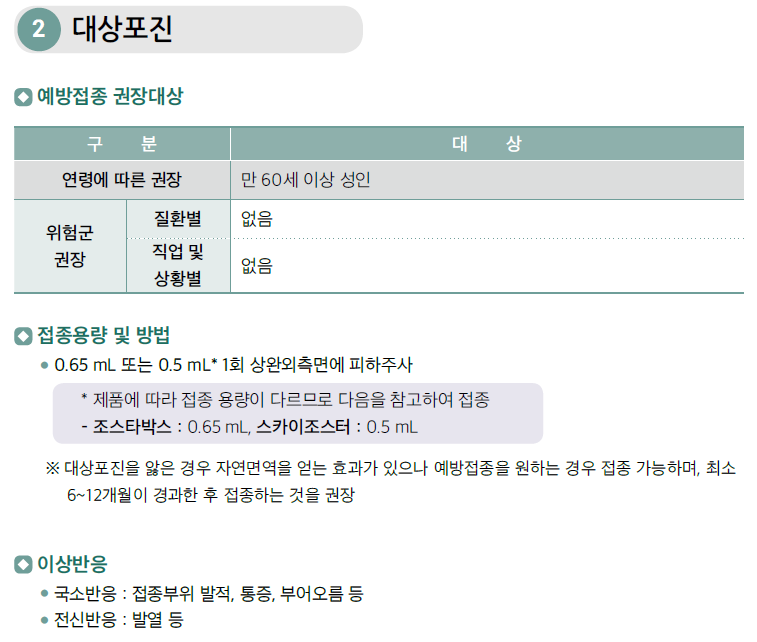 ※ 대상포진을 앓은 경우 자연면역을 얻는 효과가 있으나 예방접종을 원하는 경우 접종 가능하며, 최소 6~12개월이 경과한 후 접종하는 것을 권장이 추가되었습니다.