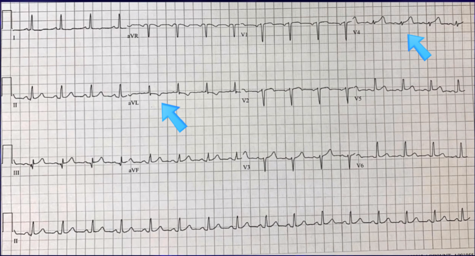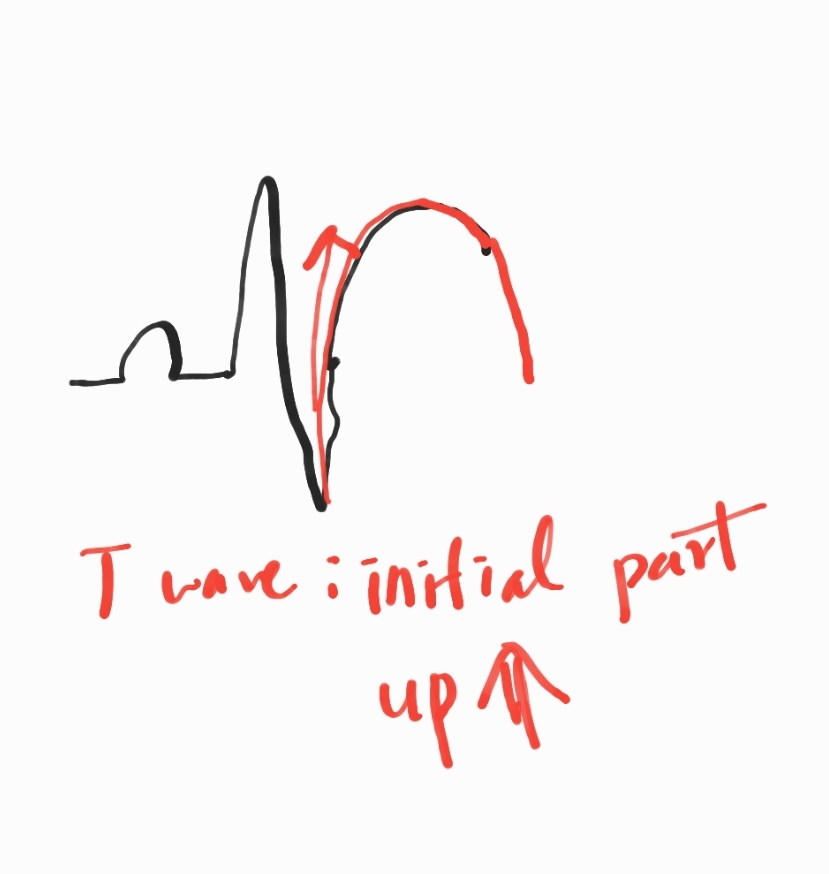 T파가 QRS가 끝난 직후 바로 위쪽으로 올라갑니다.