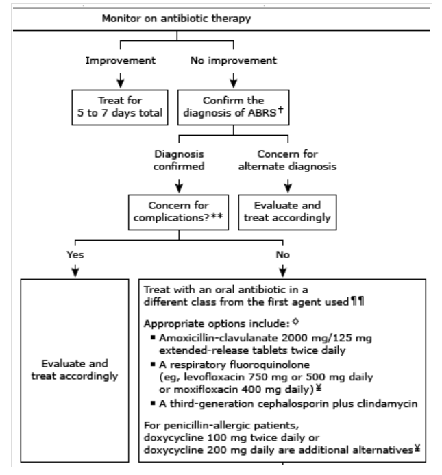 * 급성 세균성 부비동염에서 초기 경험적 항생제는 아목시실린 또는 아목시실린-클라불라네이트입니다.