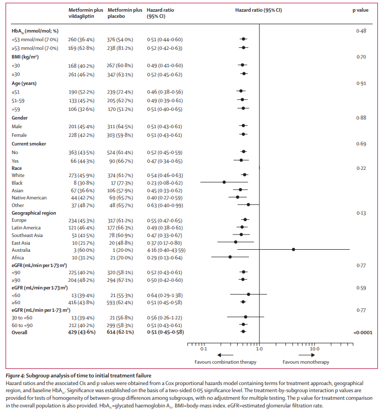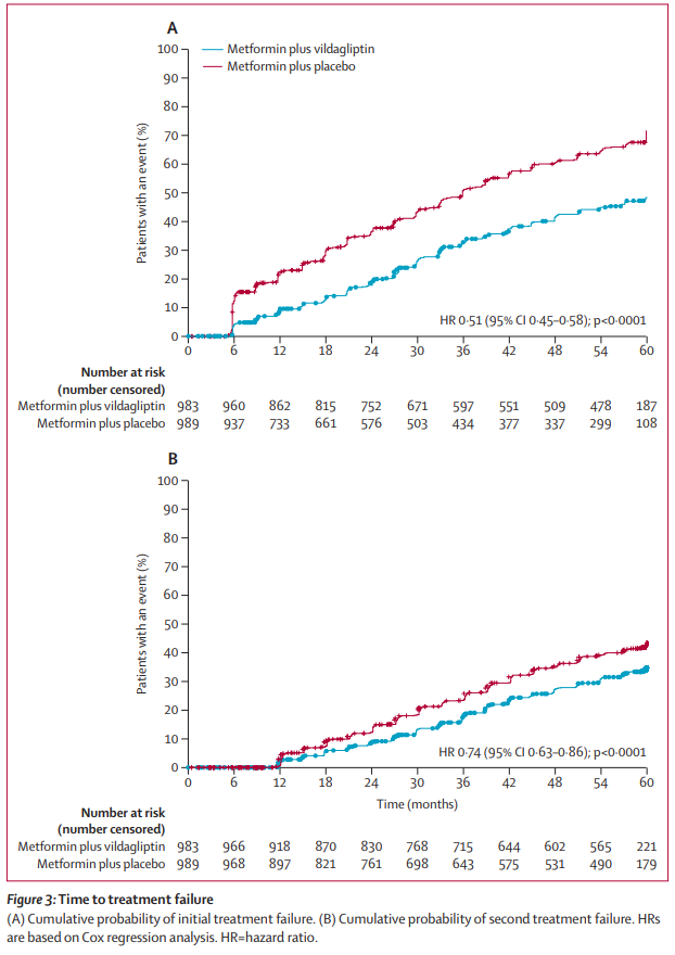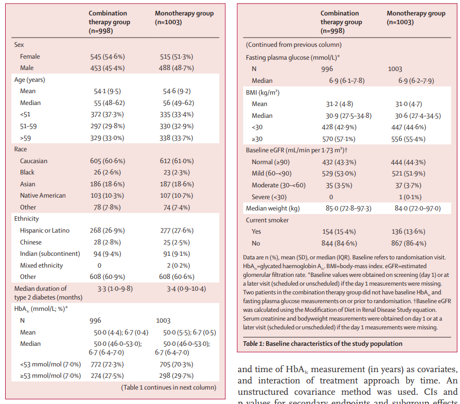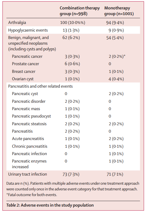 시험 등록은 2012 년 3 월 30 일에 시작하여 2014 년 4 월 10 일에 완료되었습니다. 4524 명 중 선별된 2001명 적격 참가자는 초기 병용 치료 그룹(n= 998) 또는 초기 메트포민 단일 요법 그룹(n = 1003)으로 무작위 할당되었습니다. 총 1598 명(79.9 %)의 환자가 5 년 연구를 완료했으며 초기 병용 요법 군에서는 811 명(81.3 %), 단독 요법 군에서는 787 명(78.5 %)이었습니다. 연구 기간 1 동안 초기 치료 실패는 병용 치료군에서 429 명 (43.6 %), 단독 요법 군에서는 614 명(62.1 %)이었습니다. 단일 요법 그룹에서 관찰된 중앙값의 치료 실패 시간은 36.1 개월(IQR 15 · 3 – [NR]에 도달하지 않음), 병용 요법에서는 61.9 개월(29 .9-NR)로 단지 연구 기간을 넘어서는 것으로 평가되었습니다. 초기 치료 실패까지의 시간에 대한 의미 있는 상대 위험의 감소가 5 년의 연구 기간 동안 단일 치료 그룹과 비교하여 병용 요법 그룹에서 관찰되었습니다(hazard ratio 0·51 [95% CI 0·45–0·58]; p<0·0001). 두 치료법 모두 안전하고 환자가 잘 견딜 수 있었으며 예상치 못한 또는 새로운 안전성 발견이 없었으며 연구 치료와 관련된 사망은 없습니다.