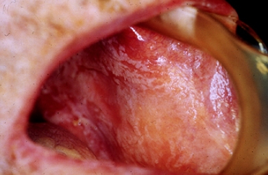 Buccal mucosa의 pseudomembrane으로 보아 oropharyngeal candidiasis(구강칸디다증, 구강인두 칸디다증)를 진단할 수 있습니다. AIDS가 아닌 환자에서 oropharyngeal candidiasis는 보통 7-14일의 국소치료제로 가능합니다. 국소치료제로 성공적인 치료를 하려면 국소치료제와 구강 점막과 적절한 접촉 시간이 중요합니다.