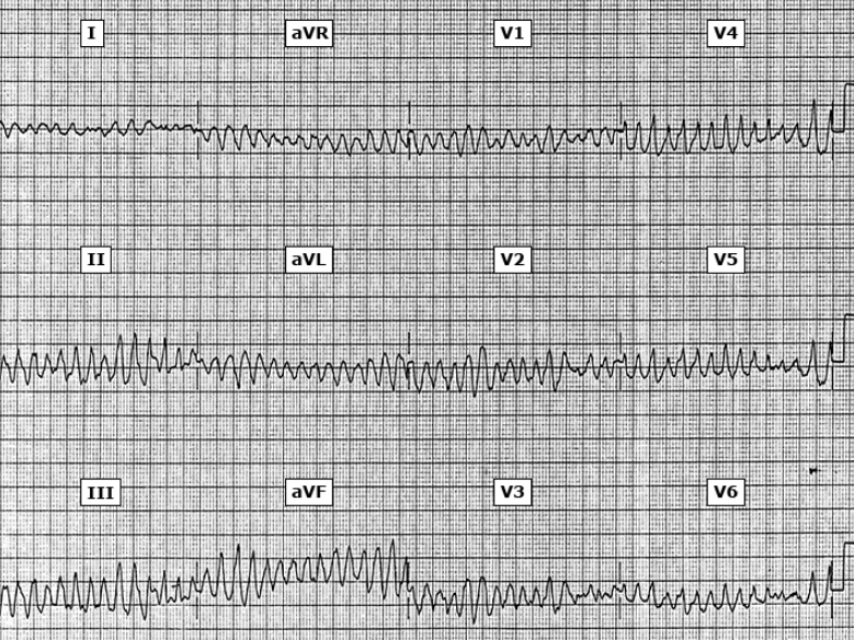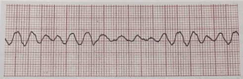 심실세동은 sudden cardiac death의 가장 빈번한 기전입니다. 빠르고 조직화되지 않은 심실 리듬으로서 일정한 심실 수축을 만들어 내지 못하므로 심근 수축도 없고 혈압도 만들어내지 못합니다. 이 결과로 sudden collapse(syncope 또는 sudden cardiac arrest)가 발생합니다. 심전도에서는 VF은 분당 300-400회의 빠르고 불규칙하고 모양이 없는 다양한 amplitude, morphology, interval을 갖는 QRST 파형으로 나타납니다. 초기에 coarse하지만 시간이 지나면 이 파들은 점점 가늘어지고 궁극적으로 무수축이 발생합니다.
