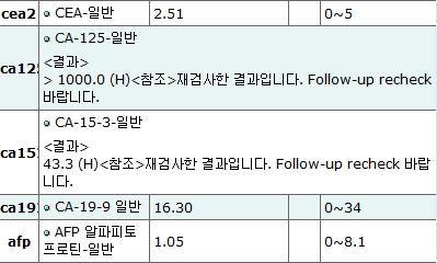 본원에서 시행한 암표지인자 검사에서 CA125 > 1000, Ca15-3 > 43.3 으로 상승한 결과가 있었고 무엇보다 CA125 > 1000으로 아주 높게 상승되어 있었기 때문에 ovary Ca.로 인한 ascites로 추정되었습니다.