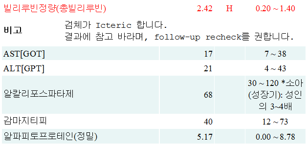 공막 황달로 시행한 혈액검사 결과에서 빌리루빈 2.42 결과 나온 환자로 오래 전부터 높았던 것 같고 10월말에 복부 CT 예정이라고 하여 본원에서의 work-up은 하지 않았습니다.