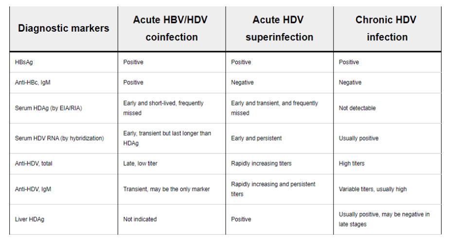 HBV에 대한 HDV의 의존성으로 인하여 HBsAg의 존재가 HDV 감염 진단을 위해 필요합니다. Hepatitis B core antigen에 대한 IgM 항체(IgM anti-HBc)의 추가적 존재가 acute HBV/HDV coinfection 진단에 필요합니다.