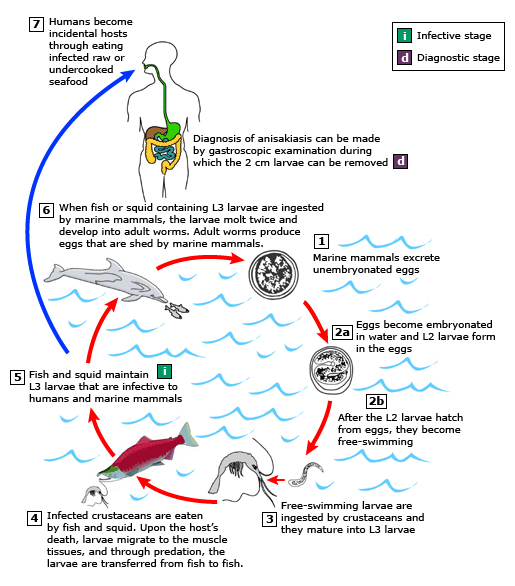 Anisakiasis의 life cycle은 해양 포유류의 대변에 unembryonated eggs을 통과시키는 것으로 시작됩니다 (그림). 물에서 1 단계 및 2 단계 유충이 형성됩니다. 이어서, 이들은 갑각류에 의해 섭취되어 근육 조직으로 이동합니다. 유충은 포식을 통해 물고기와 오징어로 옮겨져 인간과 해양 포유류를 감염시키는 3 단계 유충을 유지합니다. 해양 포유류에 섭취되면 유충은 adult worms로 되어 위 점막에 묻혀 대변에 알을 흘립니다.