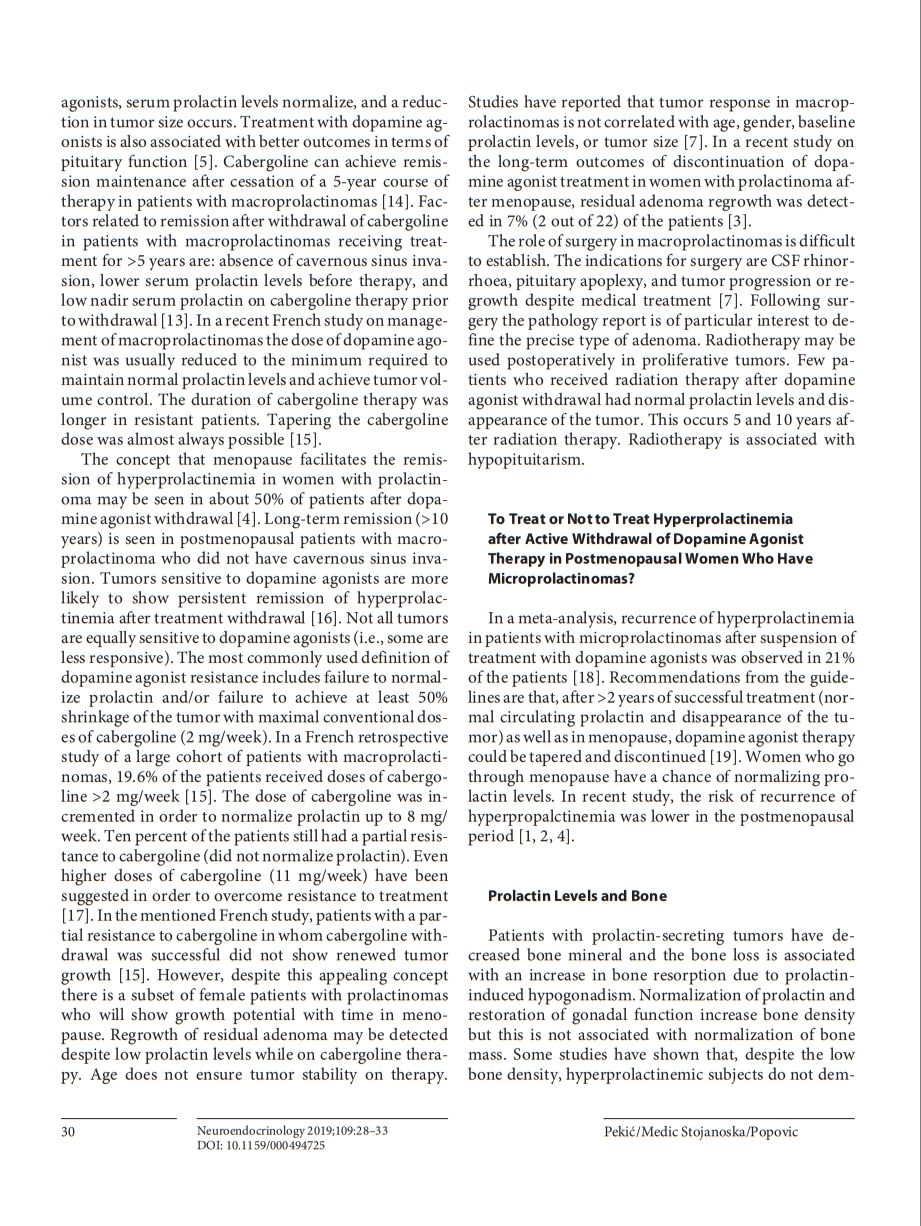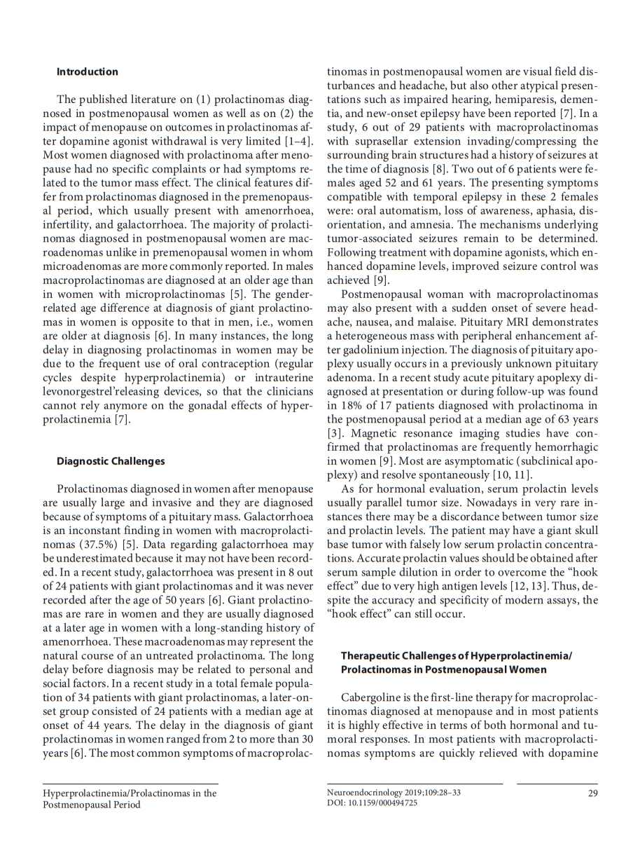 Hyperprolactinemia is not a common finding in postmenopausal women. Prolactinomas detected after menopause are usually macroadenomas. Due to atypical clinical features they may remain unrecognized for a long period of time. Interestingly the growth potential of prolactinomas remains after menopause. Most tumors are invasive and present with high prolactin levels.