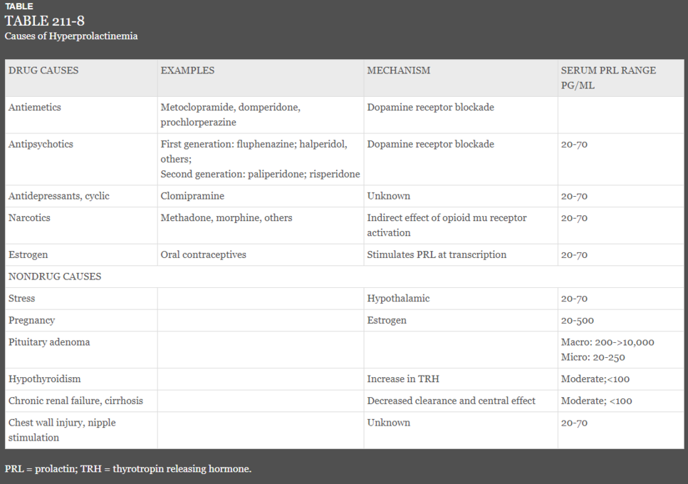 It is worth noting that many premenopausal women with hyperprolactinemia do not have galactorrhea, and many with galactorrhea do not have hyperprolactinemia.This is because galactorrhea requires adequate estrogenic or progesterone priming of breast.Conversely, isolated galactorrhea with normal prolactin levels occurs due to increased sensitivity of the breast to the lactotrophic stimulus. Thus, galactorrhea is very uncommon in postmenopausal women.