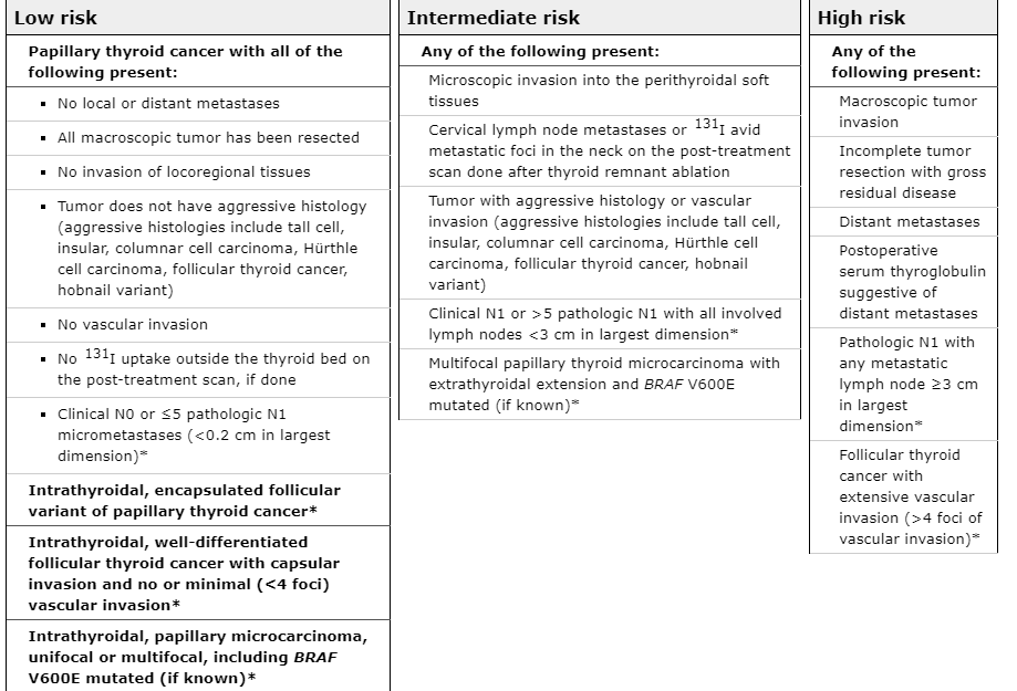 Consider* — Generally favored based on risk of recurrent disease. Smaller tumors with microscopic ETE may not require RAI. |