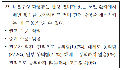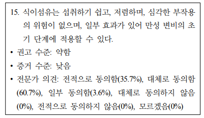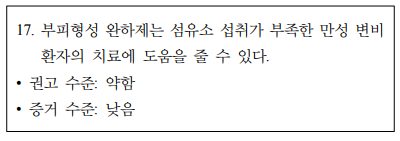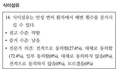 식이섬유는 경도 및 중등도의 변비를 호전시킬 수 있지만, 심한 변비에는 효과가 없다[54]. 국내 연구들에서 식이섬유는 부작용 없이 변비 치료에 효과를 나타냈다[55,56]. 식이섬유가 종종 변비 관련 증상을 악화시킬 수 있으며, 이러한 경우에는 심한 서행성 변비나 배변장애형 변비의 가능성을 고려해야 한다[57]. 특히 대변 저류가 있는 경우에는 식이섬유 섭취로 인해 경련성 복통이 유발될 수 있으므로 식이섬유 섭취를 증가시키기 전에 삼투성 완하제 처방을 고려해야 한다[51].